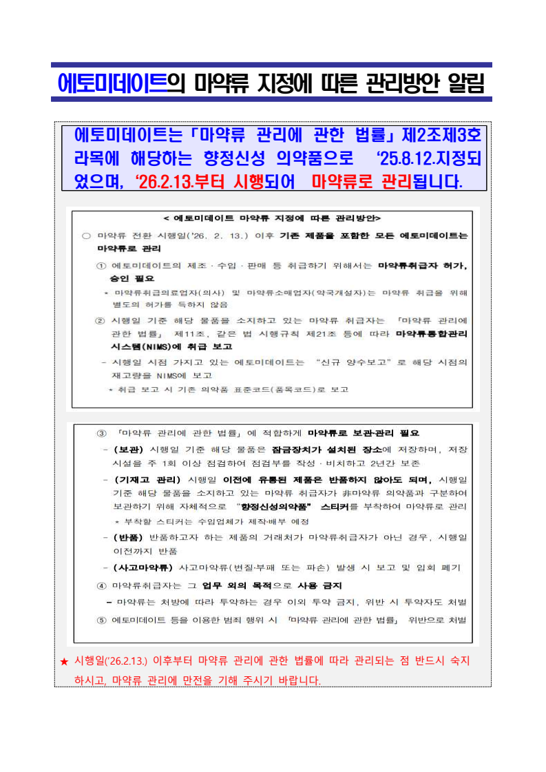 [공지] 에토미데이트 마약류(향정) 관리 전환 안내(26.01.30)