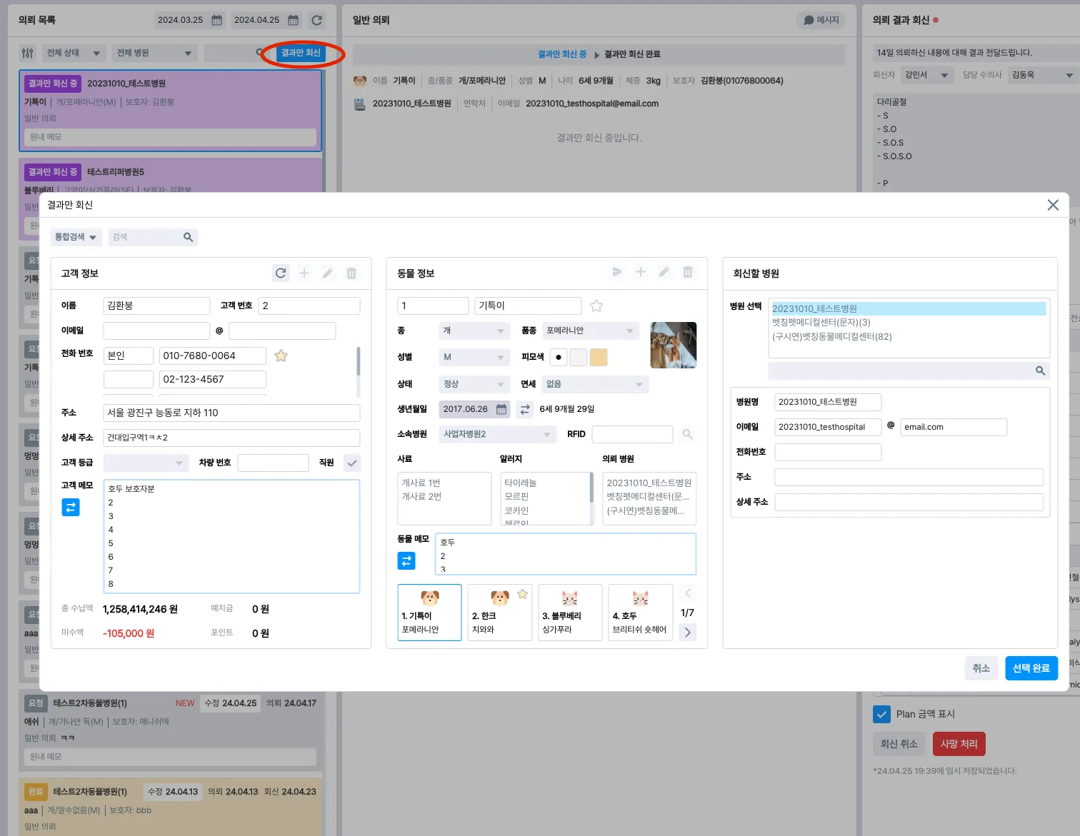 동물의 바이탈, 처방 내역, 첨부파일, 진료 이미지 등 진료 정보를 효율적으로 조회하고 선택적으로 전송할 수 있습니다.