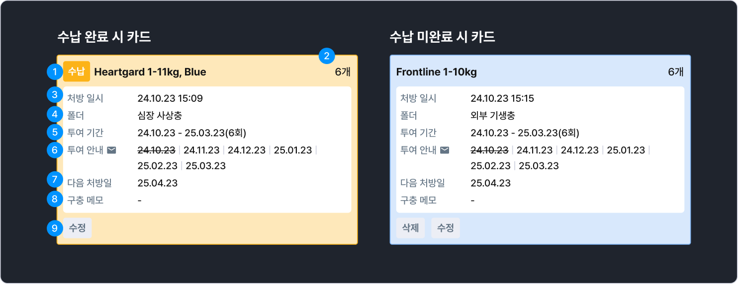 재처방 예정 구충이 색상으로 구분되어 표시돼요. 7일 이내 임박은 오렌지, 기한 경과는 레드로 표시되어 놓치는 처방 없이 체계적인 관리가 가능해요.