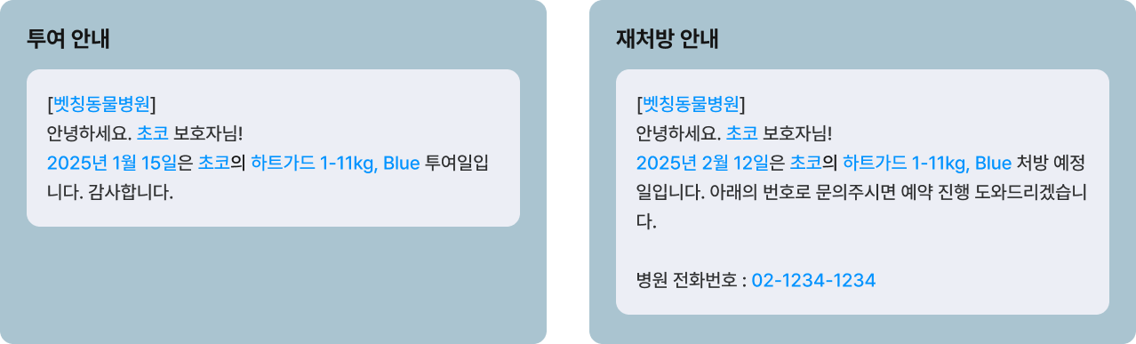 재처방 안내뿐 아니라 실제 투여 일정에 맞춰 안내 문자가 자동 발송됩니다. 투여 시작일부터 종료일까지 설정된 주기에 따라 보호자에게 알림이 전달되므로, 보호자는 정확한 투여 시점을 놓치지 않고 체계적으로 관리받을 수 있습니다.