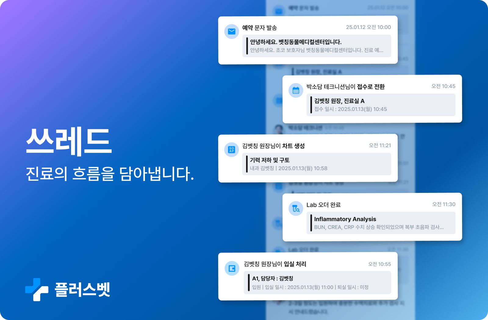 "쓰레드를 통해 모든 이벤트가 동물 단위로 구조화되면서, 데이터는 동물병원 내부의 자산이 됩니다. 이 구조 위에서 플러스벳은 최근 내원 흐름 요약, 검사 수치 변화 정리, 반복 패턴 감지 기능을 준비하고 있습니다. 곧 반영될 AI 기능은 동물병원의 데이터를 대신 이해하고 정리해주는 도구로 활용될 예정입니다."