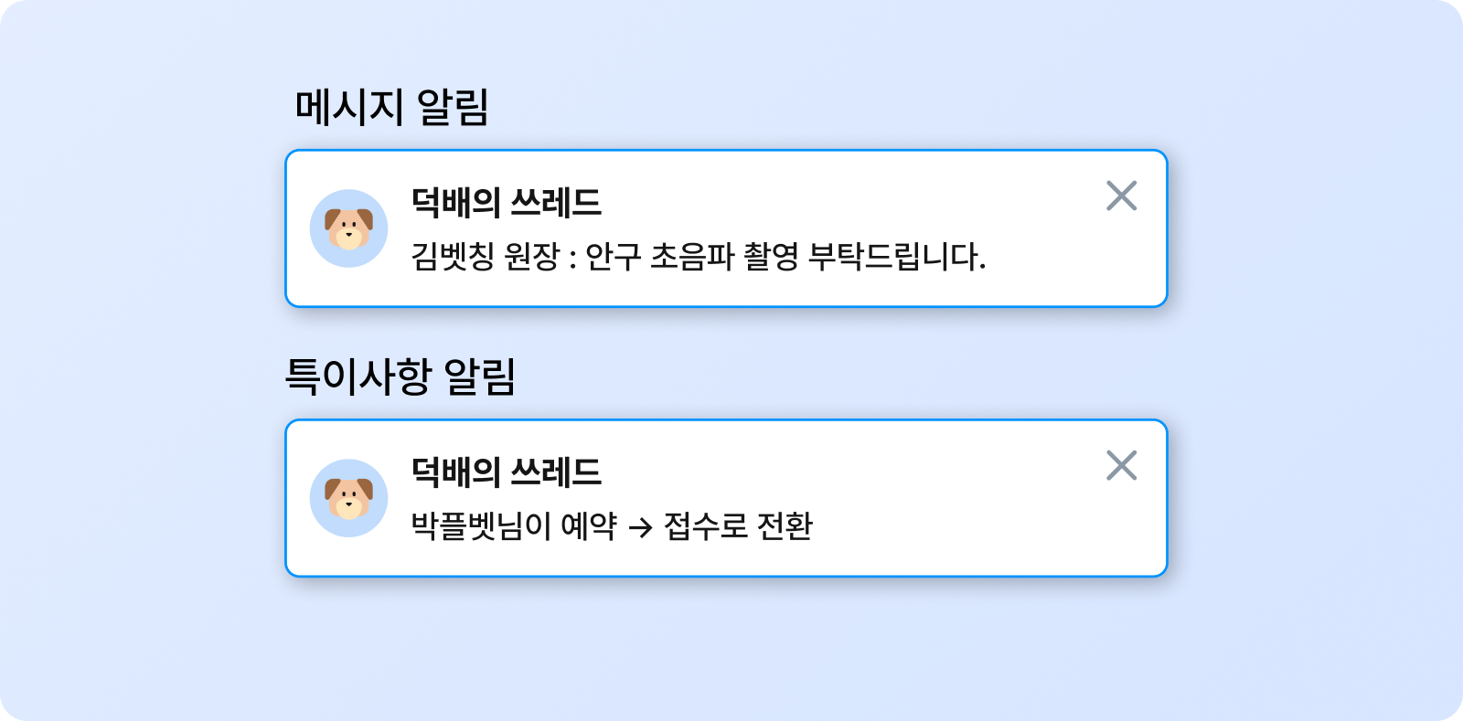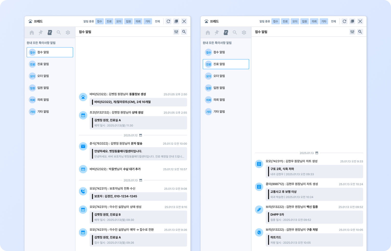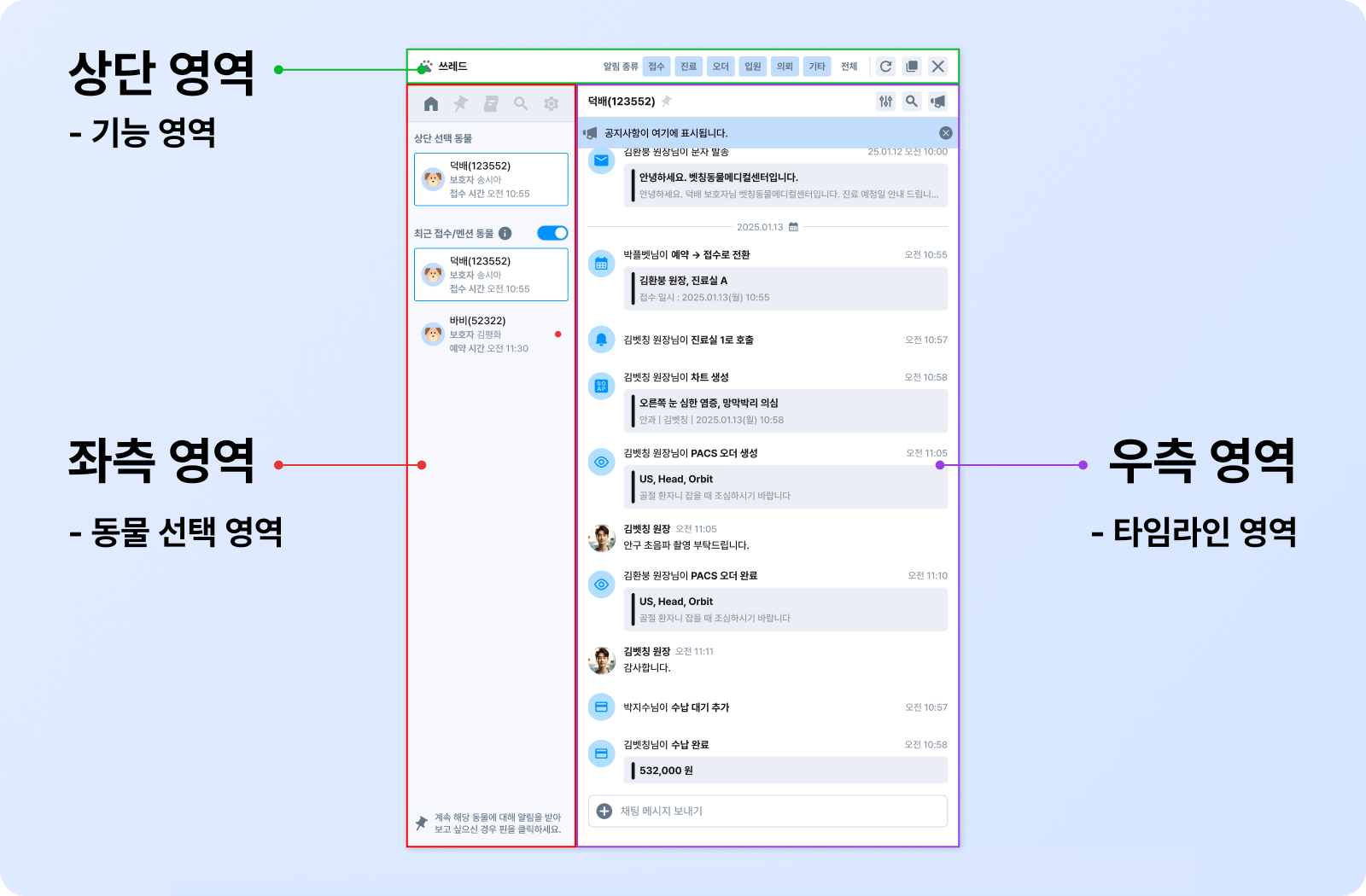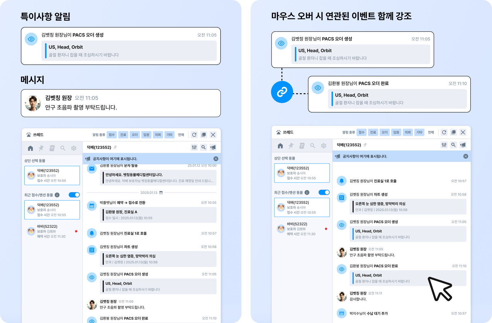 알림은 두 종류입니다. 메시지 알림은 해당 동물의 쓰레드에 새 메시지가 작성되거나 내가 멘션된 경우 표시됩니다. 특이사항 알림은 Lab·PACS 오더 생성·완료, 수납 상태 변경, 접수·방문·입원·의뢰·리콜·조제 관련 이벤트 발생 시 표시됩니다.