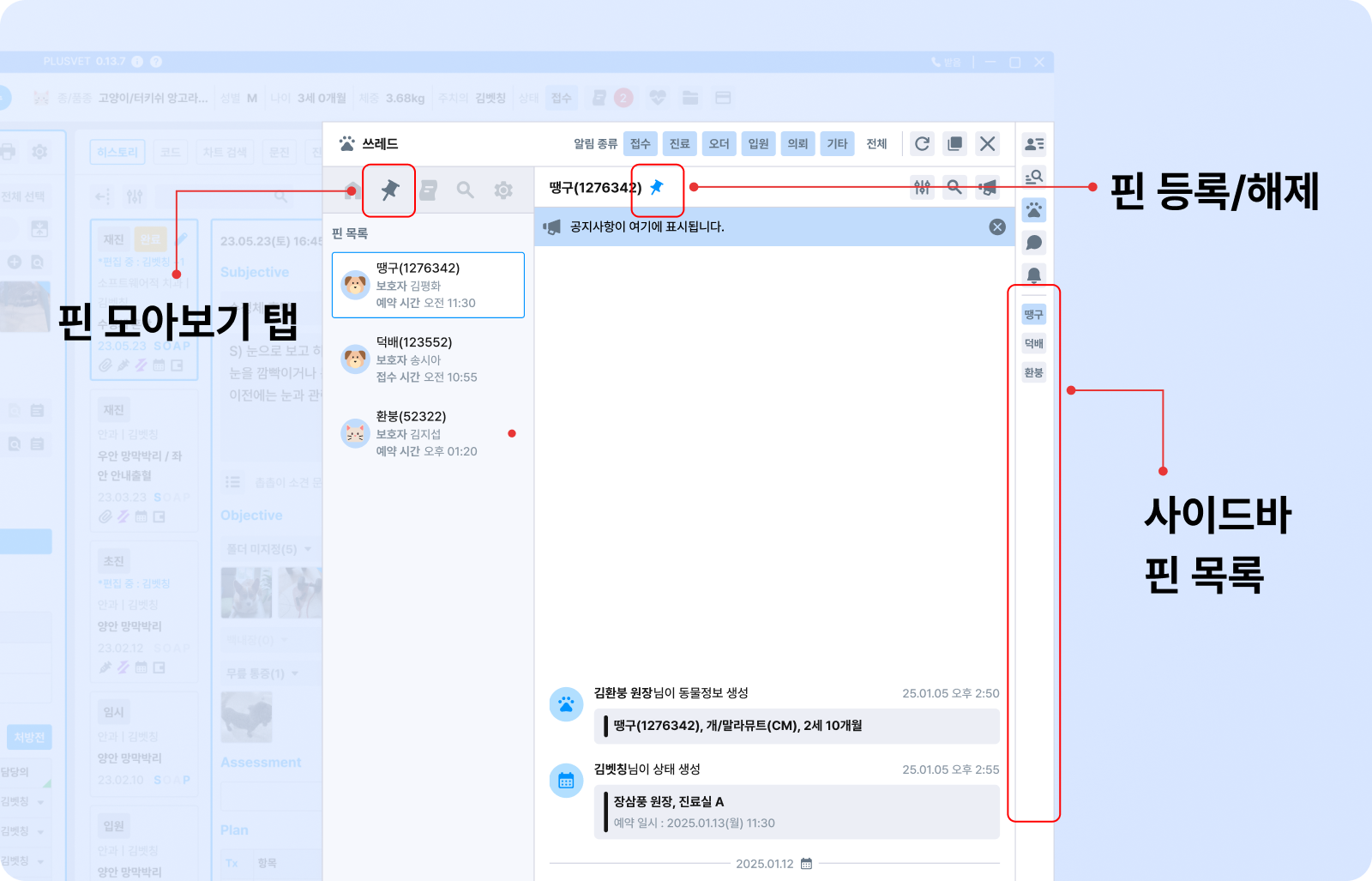 수술 예정 환자, 입원 환자, 장기 치료 환자처럼 집중 관리가 필요한 동물은 핀으로 등록할 수 있습니다. 핀을 설정하면 해당 동물에서 발생하는 모든 주요 이벤트가 전역 알림 대상이 되며, 우측 사이드바와 핀 모아보기 탭에 자동으로 추가됩니다. 핀은 사용자별 개인 설정으로, 한 사용자의 핀 설정이 다른 사용자에게 적용되지 않습니다.