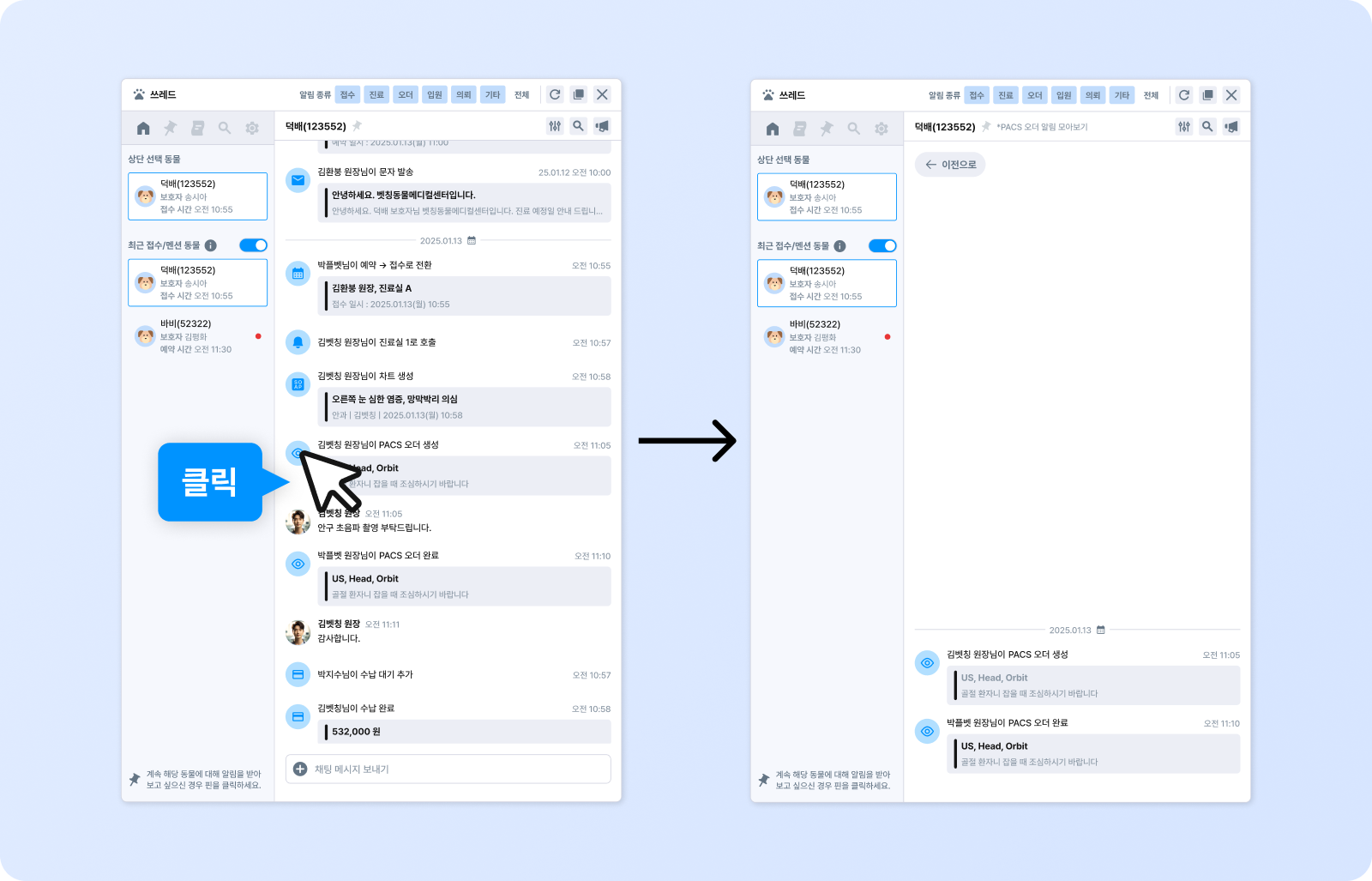 진료 중 원장의 지시가 있었거나, 이전 단계에서 어떤 처치가 진행되었는지 확인이 필요한 상황에서쓰레드를 통해 바로 이력을 확인할 수 있습니다.