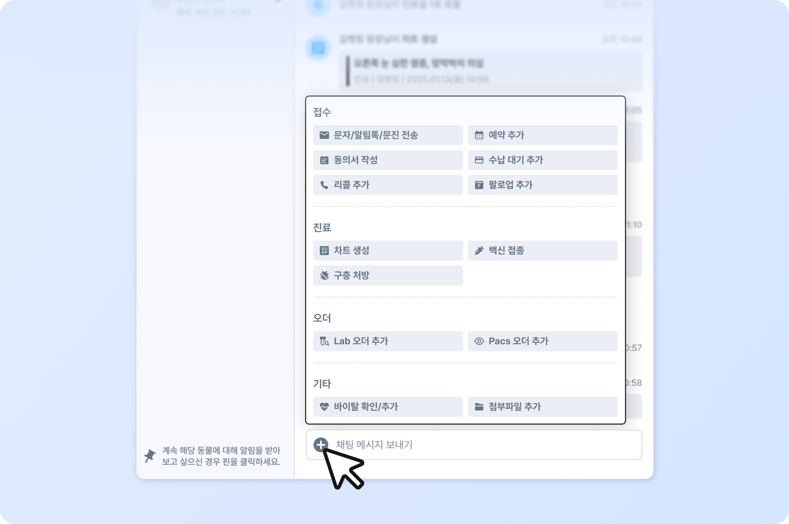 입력창 좌측 + 버튼을 누르면 진료 도구함이 열려요. 여기서 실행한 모든 행위는 해당 동물의 타임라인에 자동으로 기록돼요.